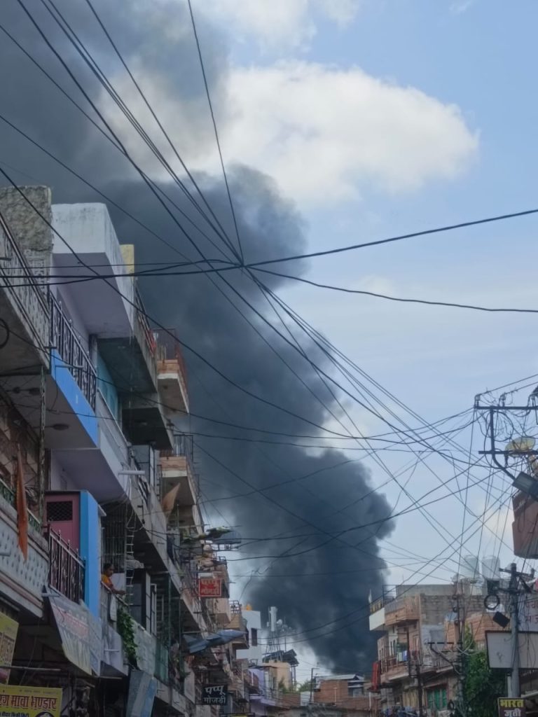 जोधपुर के सिवांची गेट क्षेत्र स्थित रेग्जीन फैक्ट्री में आज (4 अक्टूबर) दोपहर अचानक भीषण आग भड़क उठी. कुछ ही मिनटों में आग ने फैक्ट्री को पूरी तरह अपनी लपटों में समेट लिया. फैक्ट्री जनता मिष्ठान भंडार के गोदाम के सामने स्थित अप्पू रैग्जीन नामक फैक्ट्री है. आग इतनी भयंकर थी कि लपटों के साथ उठता काला धुआं आसमान को ढकता चला गया. शास्त्री नगर से लेकर पाल रोड और बासनी क्षेत्र तक, शहर के अलग-अलग हिस्सों में धुएं का घना गुब्बार दिखाई देने लगा. लोग घरों के बाहर निकलकर आ गए.